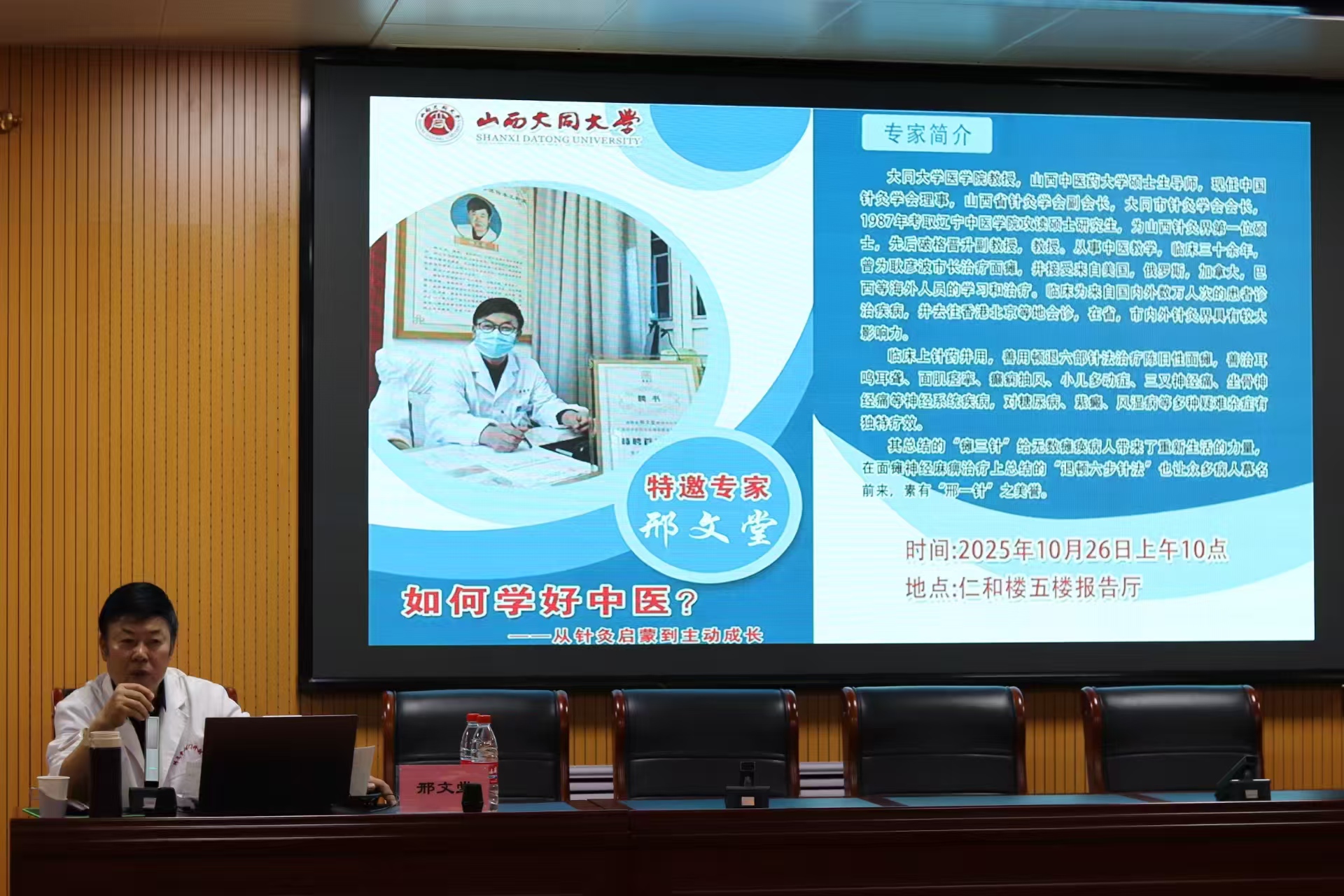 2025年10月26日,7790cnm必发集团为2025级新生举办了一场别开生面的入学专题讲座。学院特邀中国针灸学会理事、山西省针灸学会副会长、素有“邢一针”美誉的邢文堂教授,以“如何学好中医?——从针灸启蒙到主动成长”为题,引领同学们走进中医的世界,领略针灸的独特奥妙。