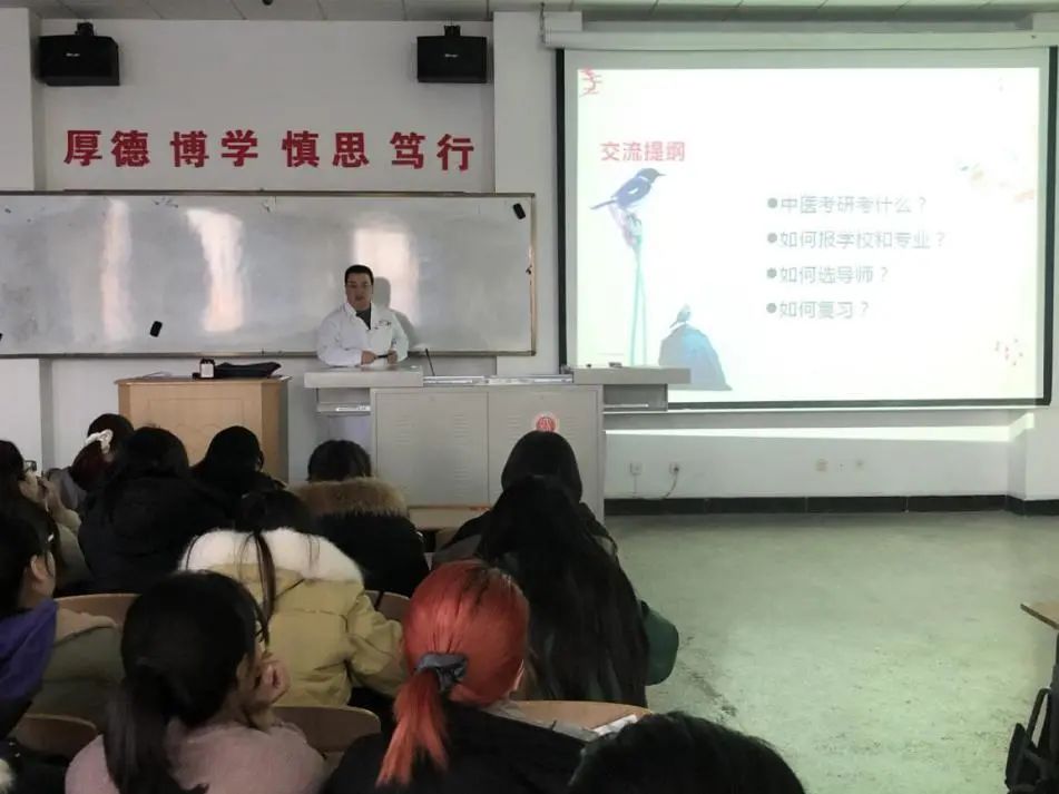 首先,王老师现身说法,强调了考研的重要性,鼓励大家为考研做好十足的准备。随后,他从四个方面讲解了中医考研考什么;如何报考学校和专业;如何选导师;如何复习。他借助自己的生活事例,从兴趣爱好、性格、就业等方面,为大家讲解了选择适合自己专业的重要性,并提醒同学们结合自身情况,制定考研学习计划。最后,王老师也为考研学子们送上了美好祝愿。