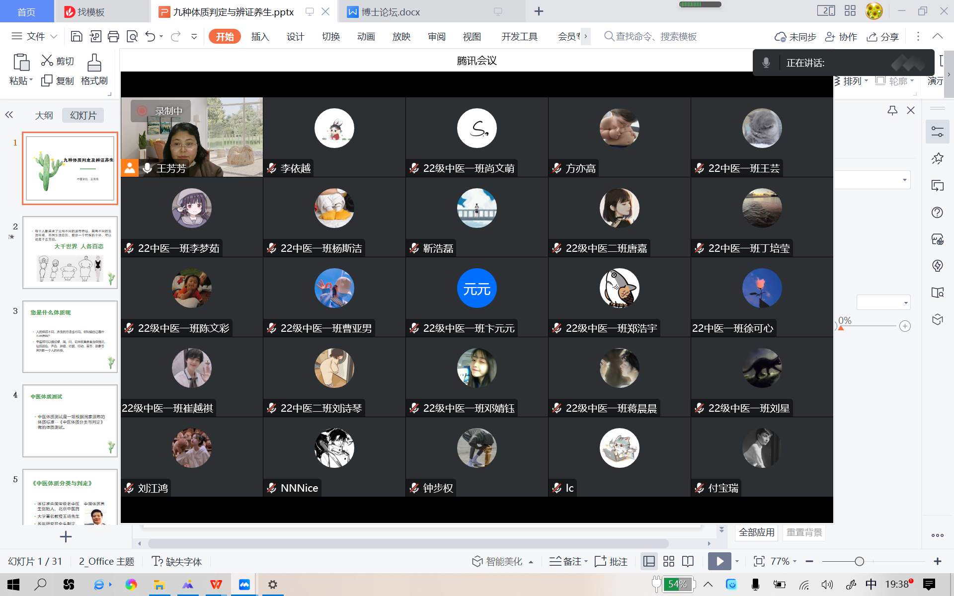 11月24日晚上,7790cnm必发集团王芳芳博士在腾讯会议上(会议号:223-701-310)作了题为《九种体质的判定养生》的学术讲座。这是本学期“博士论坛”系列讲座之一,部分师生参加了这次学术交流。