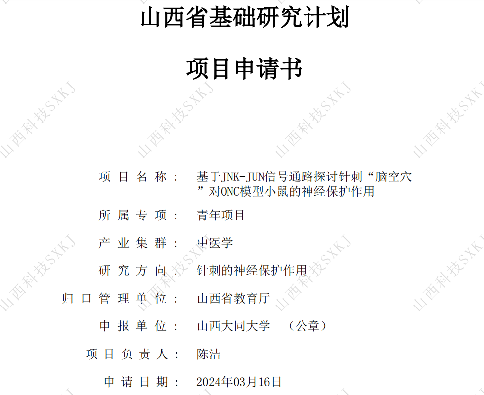 陈洁老师自2023年入职我院以来,工作认真负责,积极投身教学和科研工作,于2024年6月5日获批山西省科学技术厅青年项目——基于JNK-JUN信号通路探讨针刺“脑空穴”对ONC模型小鼠的神经保护作用,并获得5万元科研经费。