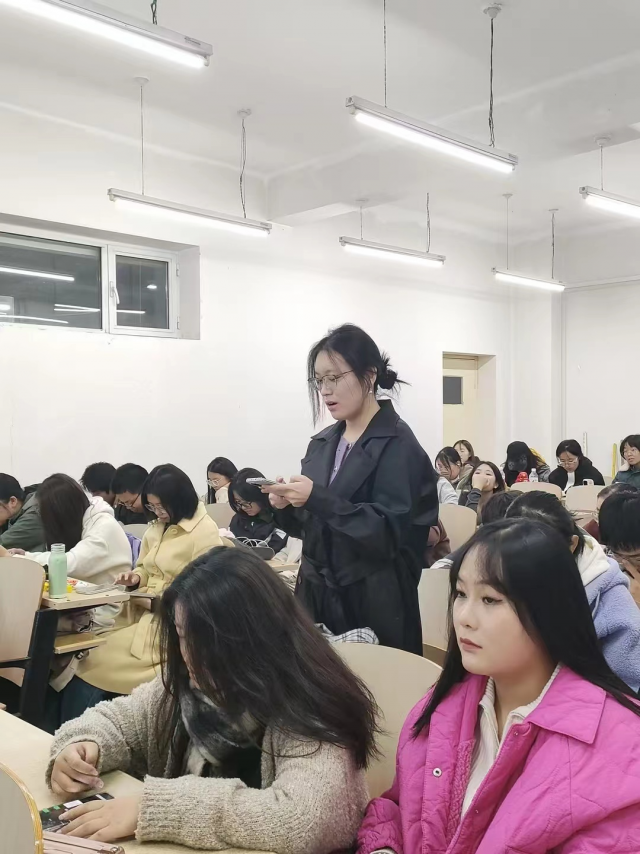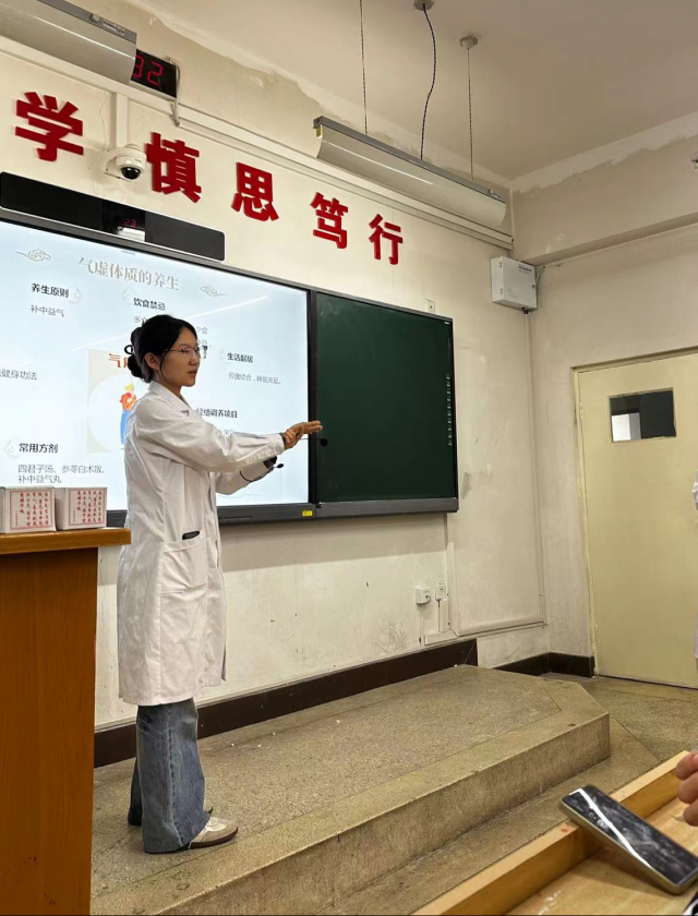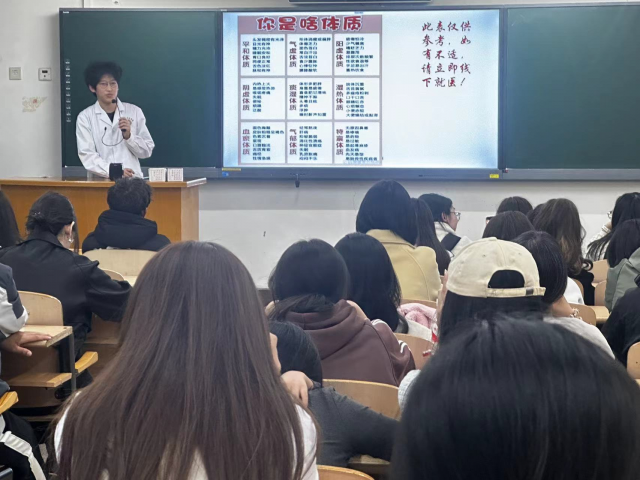 首先由刘冠亦同学就中医体质分类等话题进行了深入浅出的讲解,接着张文暄同学带领大家对自己的体质进行辨别和分析,现场许多同学根据自己的生活习惯来分享对个人体质的判断,不仅让在场的听众对自己的体质有了更深入的了解,也激发了大家对中医养生的兴趣。最后,李依越同学讲述了不同体质应该如何进行养生,从饮食、生活、起居和运动方式等方面为同学们提供了专业的建议,并且带领现场同学们找到能够调养的穴位,使同学们对中医养生有了更直观的认识和感受。