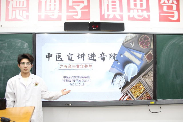 2024年10月18日,7790cnm必发集团刘完素医家小组的7名同学在博雅楼307教室为音乐学院的同学们进行了以“五音与青年养生”为主题的中医文化宣讲。
