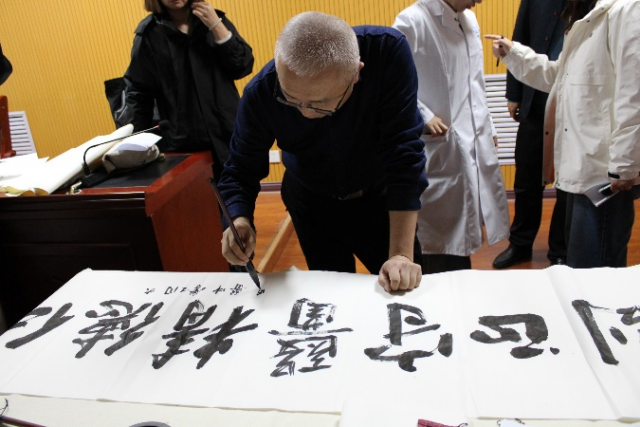 在讲座中,胡老师从哲学的角度出发,指出了书法艺术与中医学的关系,书法与中医都是中国文化的重要组成部分,体现了中国文化的思维方式和生命态度;指出历代中医大家在书法领域的卓越成就,以及清代、民国时期名医的药方文化,形成药方之美,深刻体现了中医与书法融合的深厚文化底蕴;最后,胡老师勉励中医学子要持之以恒,坚守自己的本心,将中医文化和书法文化传承下去。讲座结束后,胡老师挥毫泼墨,现场书写了“杏林书苑”“大医精诚”“仁德精医,守正创新”三幅书法作品赠予我院。