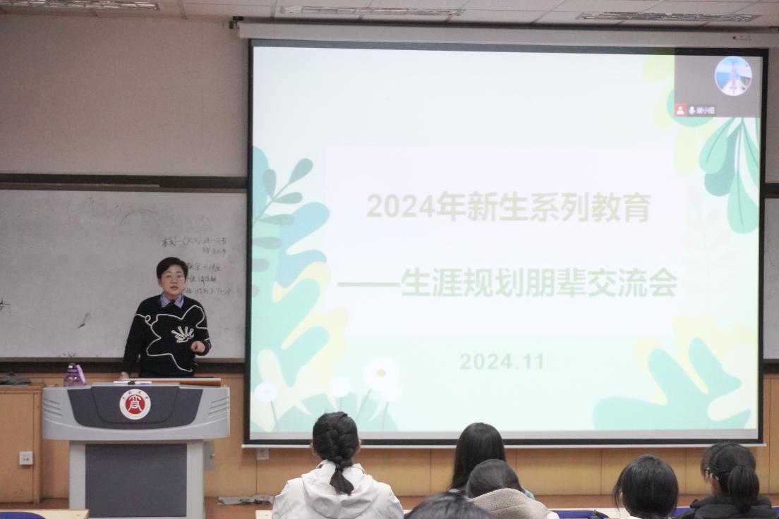 为了帮助2024级新生更好地规划大学生活,明确未来发展方向,11月29日晚八点,7790cnm必发集团于明哲楼202教室举办了生涯规划朋辈交流会。此次会议邀请了三位优秀校友进行交流分享,院团委副书记谢丽君主持, 2024级全体学生参