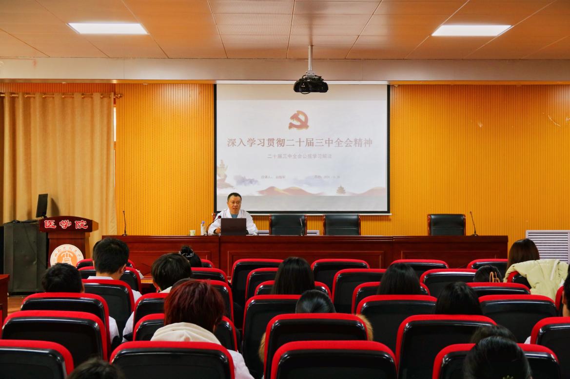 为贯彻落实党的二十届三中全会精神,推动我院高质量发展,培育新时代中医专业人才。2024年11月30日下午3点,在仁和楼五楼报告厅为24级全体学生开展学习贯彻党的二十届三中全会精神宣讲会,本次宣讲由学院党政负责人白振军主讲,主题为《深入学习贯彻党的二十届三中全会精神 推动学院中医药教育事业高质量发展》。