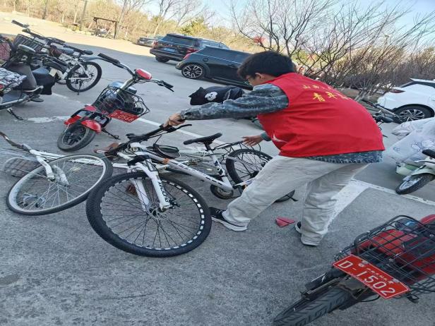 经过一番努力,原本杂乱无章、东倒西歪的车辆被摆放得整整齐齐。看着重新排列有序的车辆,志愿者们的脸上露出了欣慰的笑容。